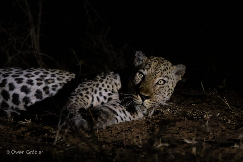 A runner picked up on tiny drag marks. Villiers Steyn joined myself and Katie to follow up , Vil did a great job of following the drag as the leopard had moved the kill hundreds of metres through some difficult brush. Turns out the kill was a house cat, I cable tied the cats leg to a stump and set up a trail cam. The leopard came back half an hour after we left and snapped the tie with ease. I only have this screen shot, no idea what I did with the actual shot. We were able to identify the cat as the resident female, Villiers named her Kalua, going off Vil’s days of running a project I think she is at least 8 years old now.